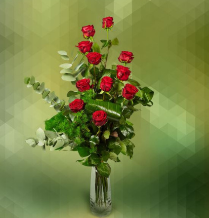 Le rose vengono confezionate con verde decorativo, rete rossa e cellophane e coccarda rossa e e bigliettino Gruppo Europeo Fiori